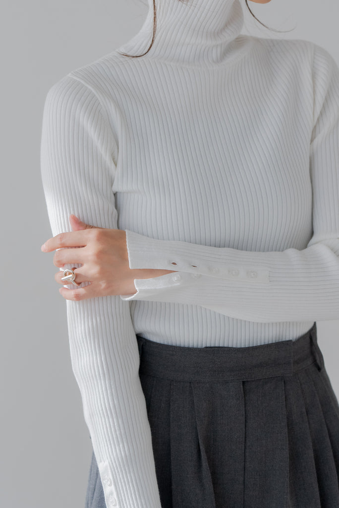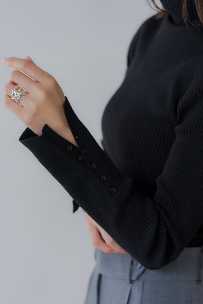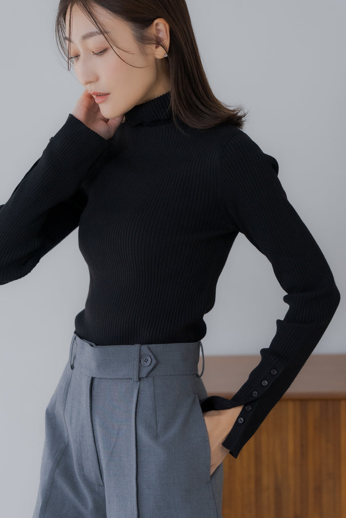 首元と袖にあしらわれた上品なボタンディテールがポイントのリブタートルネックニット。