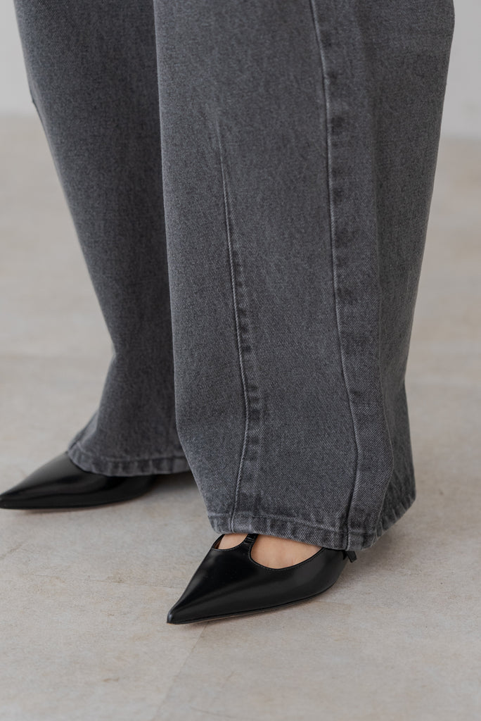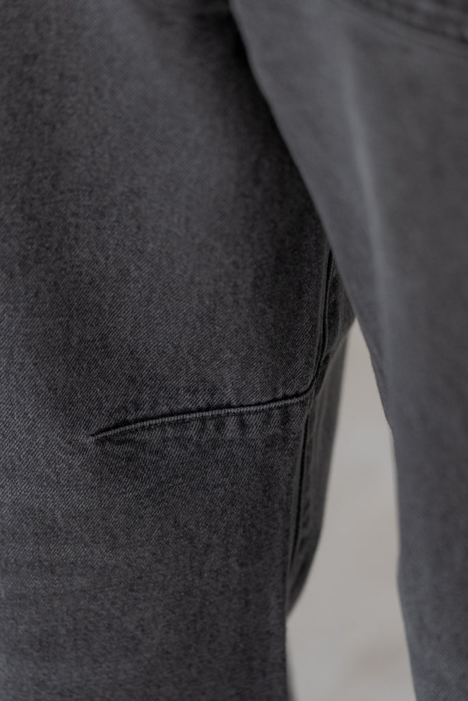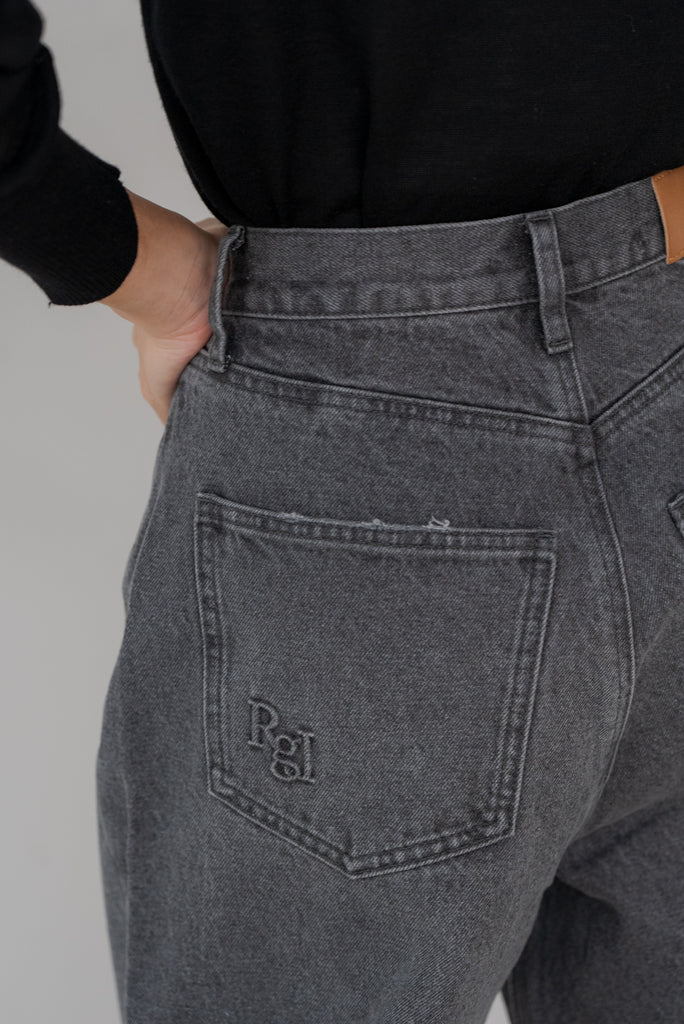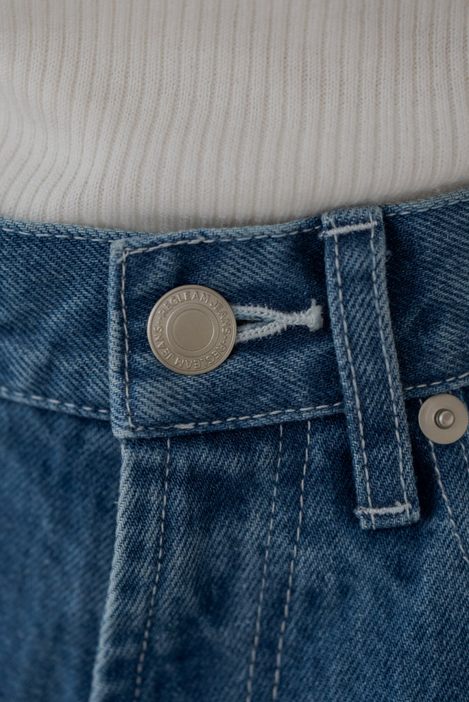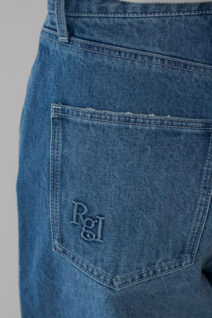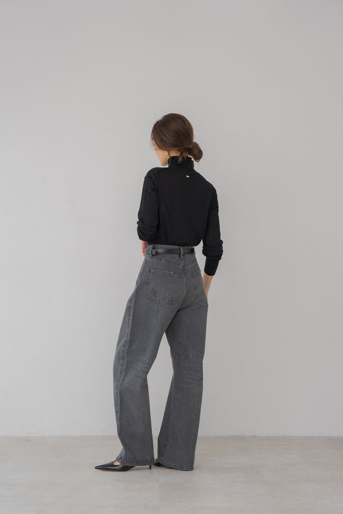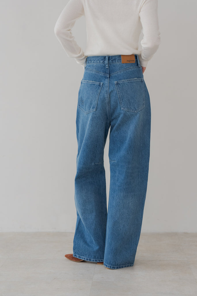 緩やかなカーブシルエットで程よいゆとりと落ち感のあるデニム。裾と膝裏に入れた切り替えで、フォルムが際立つデザインに仕上げました。ポケットに入れたエンボスロゴがワンポイントになり特別な一枚に。