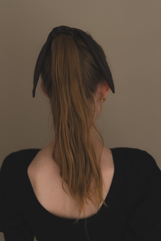 長めのリボンとエコレザーで甘くなりすぎないリボンデザインに仕上げました。さっとまとめるだけで大人可愛いヘアアレンジのポイントになり、デイリーからお出かけまで幅広く活躍するアイテムです。